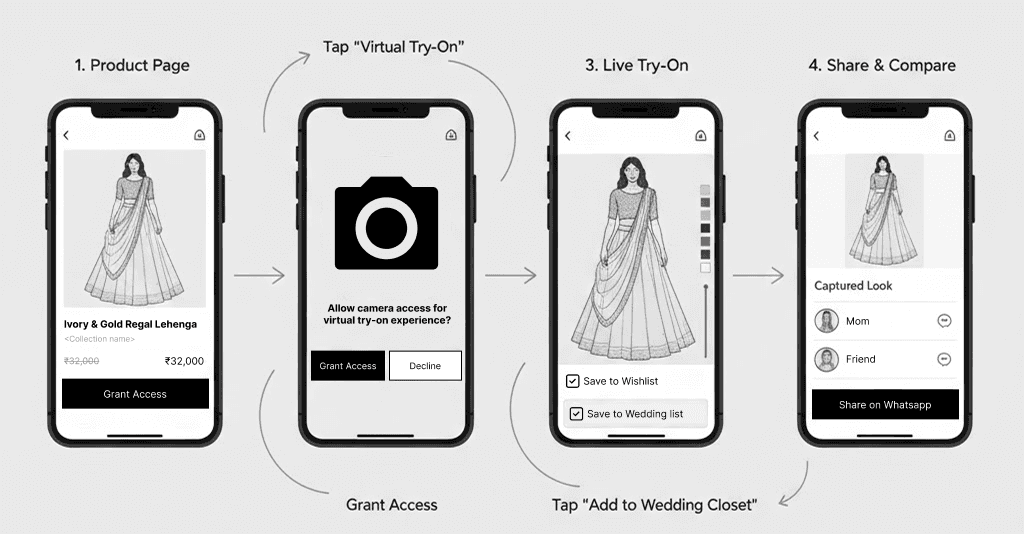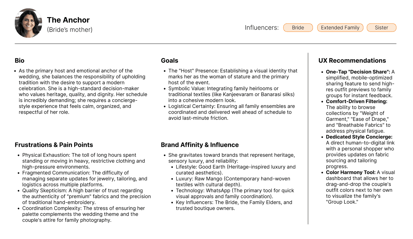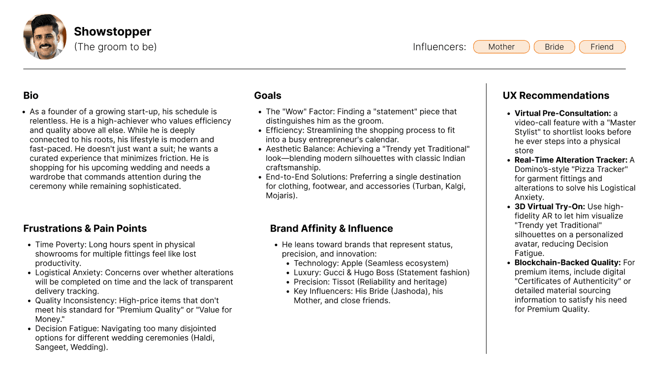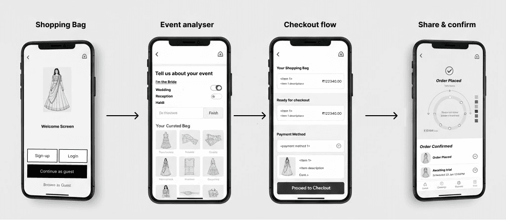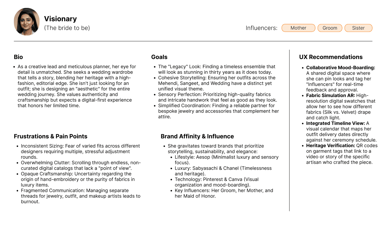 Competitive Benchmarking – analysed leading Indian ethnic-wear sites and global weddingwear platforms to understand gaps in navigation, personalisation and mobile user experience.